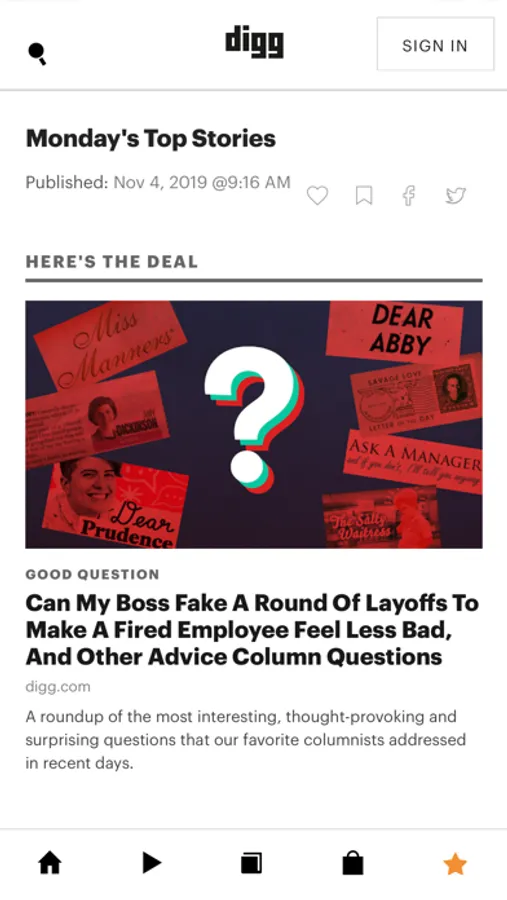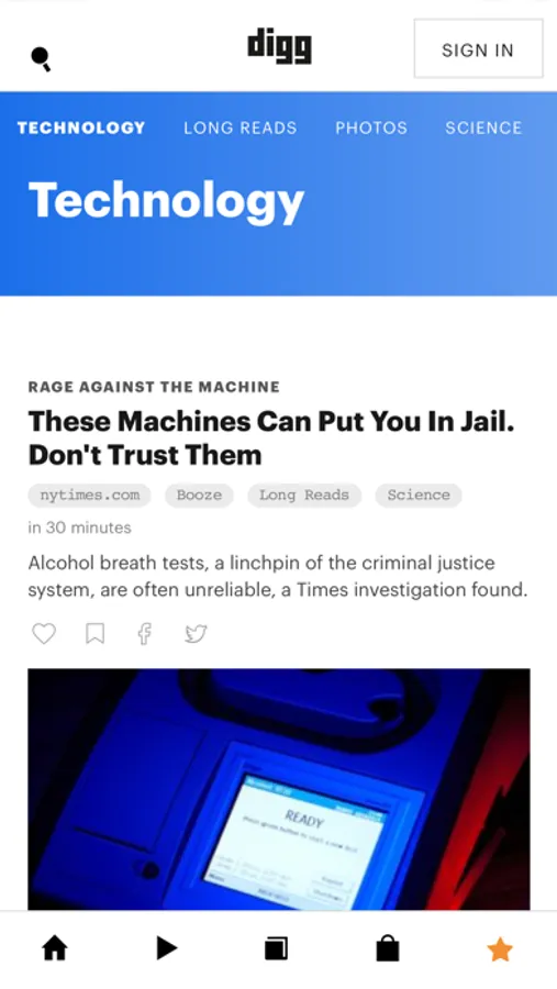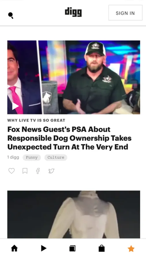 Powered by social signals and discerning taste, our editors turn the Internet's vast and cacophonous flood of articles, blog posts, and videos into an elegant and engrossing mix known as Digg.