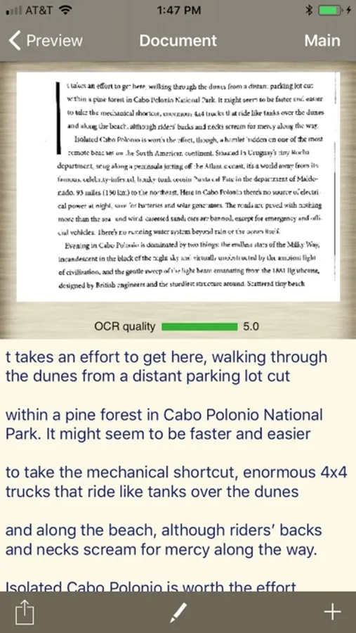 Perfect OCR scans your documents using advanced image-processing algorithms to eliminate uneven lighting and shadows and improve contrast. The result is the clearest and most readable scans possible from the iPhone's camera. Perfect OCR also offers SureScan, our proprietary scanning mode that delivers sharper images with less jitter or smear.