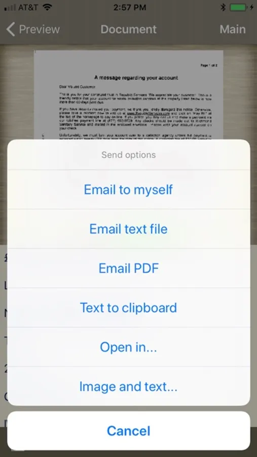 Our unique "Email to myself" feature lets you send documents to a predefined address, or even upload them to an online storage service like Evernote or Box.net, with a single tap. Uploading documents to online services via email is fast, secure, and can be done even if you're temporarily off line. Refer to app help for details.