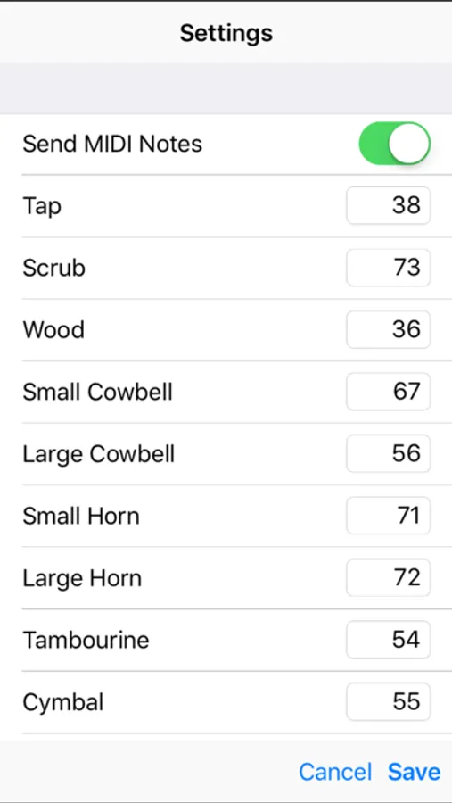 If you have any MIDI equipment, you can also use Washboard as a MIDI controller. Map each instrument in the app to a note number in your sound module, then tap the board or attached instruments to send note-on commands. The MIDI commands are sent on channel 10 for easy access to most percussion modules.