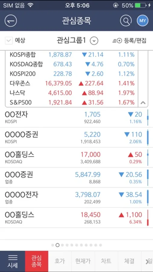 - 지수 정보를 모든 메뉴에서 확인이 가능하여 터치하여 전체 주요지수 정보를 확인 가능(지수 정보는 관심종목 화면에서만 노출)
