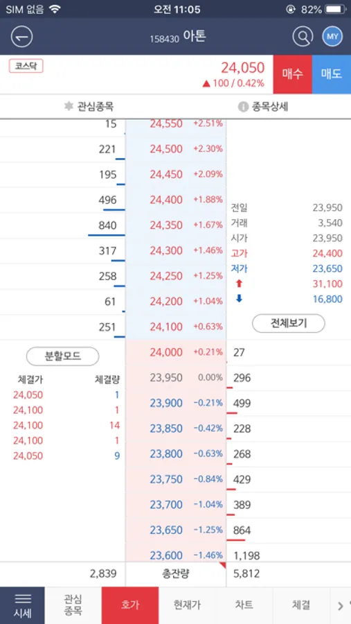 - 한 화면에서 호가 정보 확인 및 종목 수량을 입력 후 원터치 주문 가능