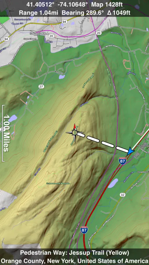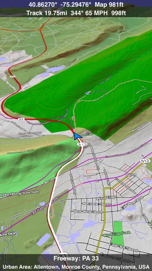 Want to learn more about a map feature? Tap the target icon and center the feature under the compass rose to display its name, type, urban area, county, state, elevation and coordinates. You will also see a bearing line back to your current GPS location or from your location to a selected waypoint. The status bar shows the bearing direction and distance along with the map and GPS elevation, the track length, and your current speed and direction of travel.
