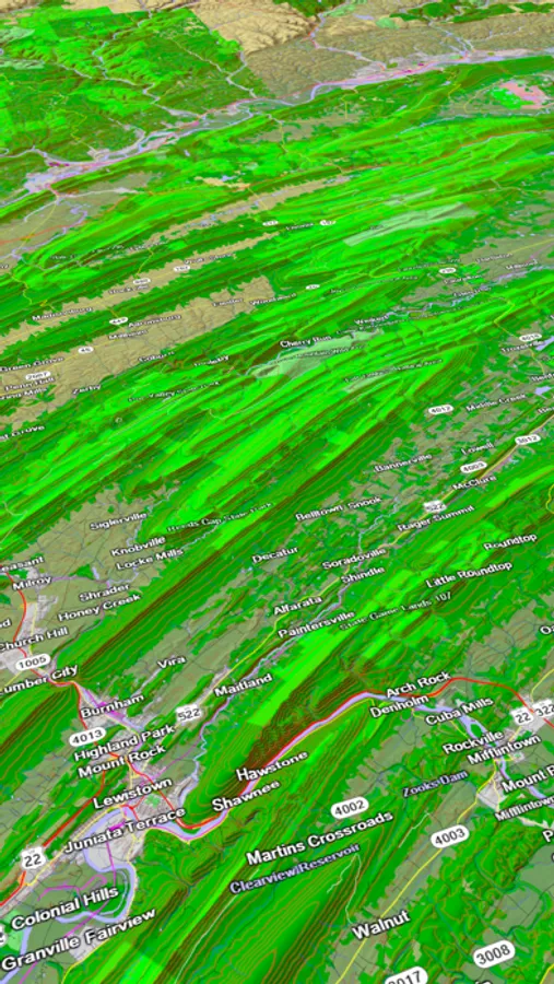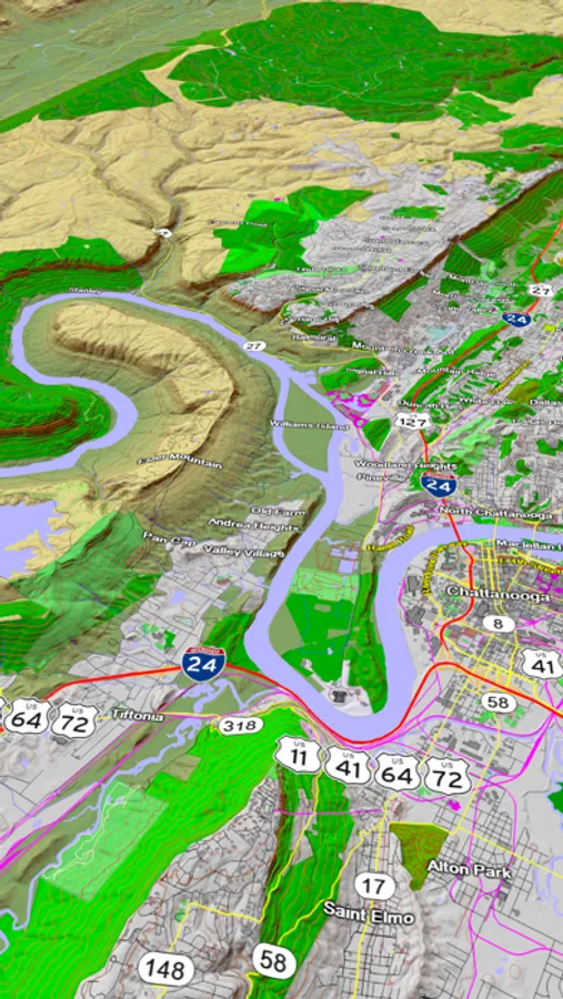 A 3D topo map of the Eastern USA. The vector map data is contained within the app and can be used without an internet connection. Use it in a car, a boat, a plane or while hiking. It is like having more than a third of the country in your pocket.