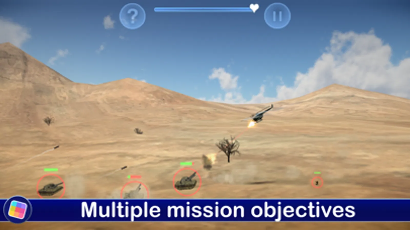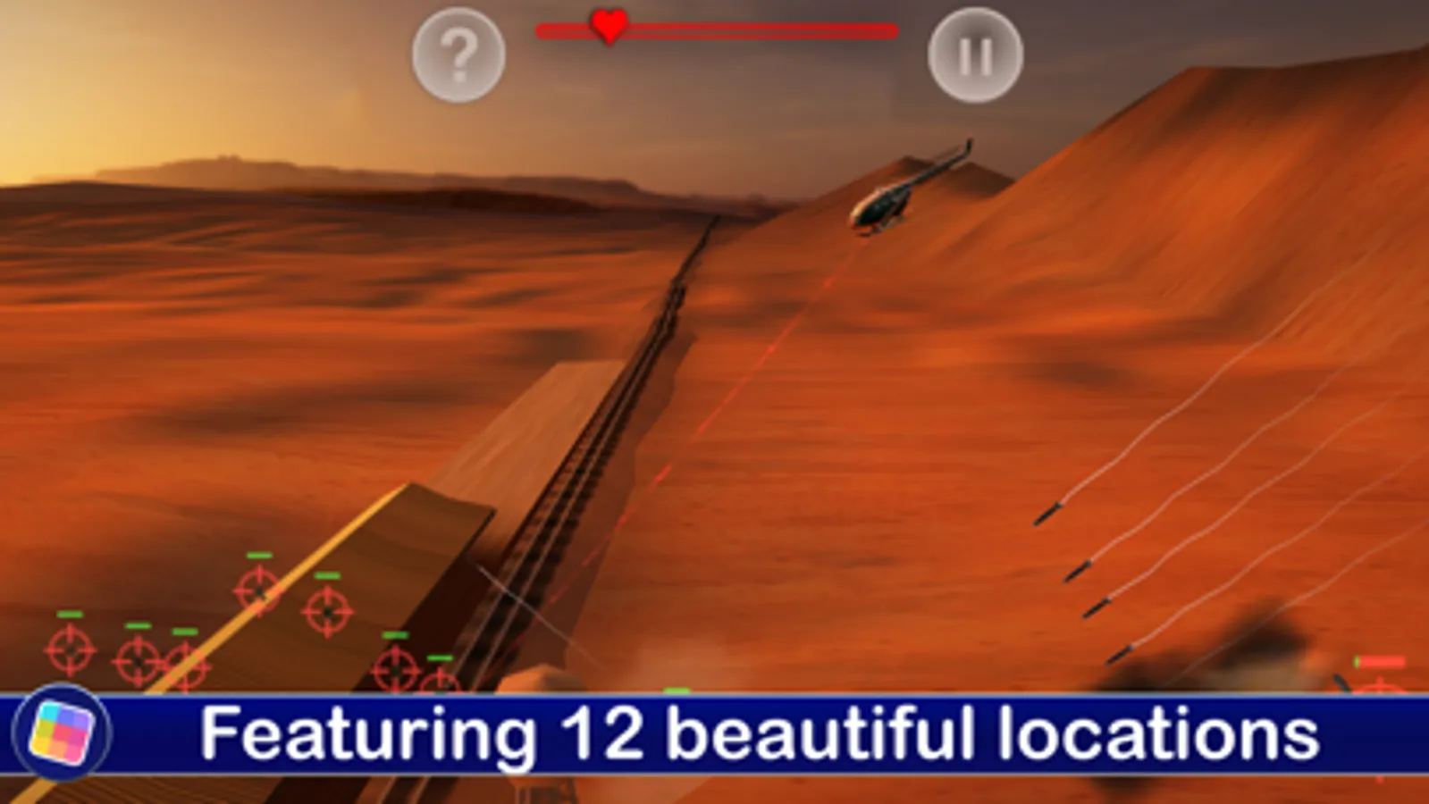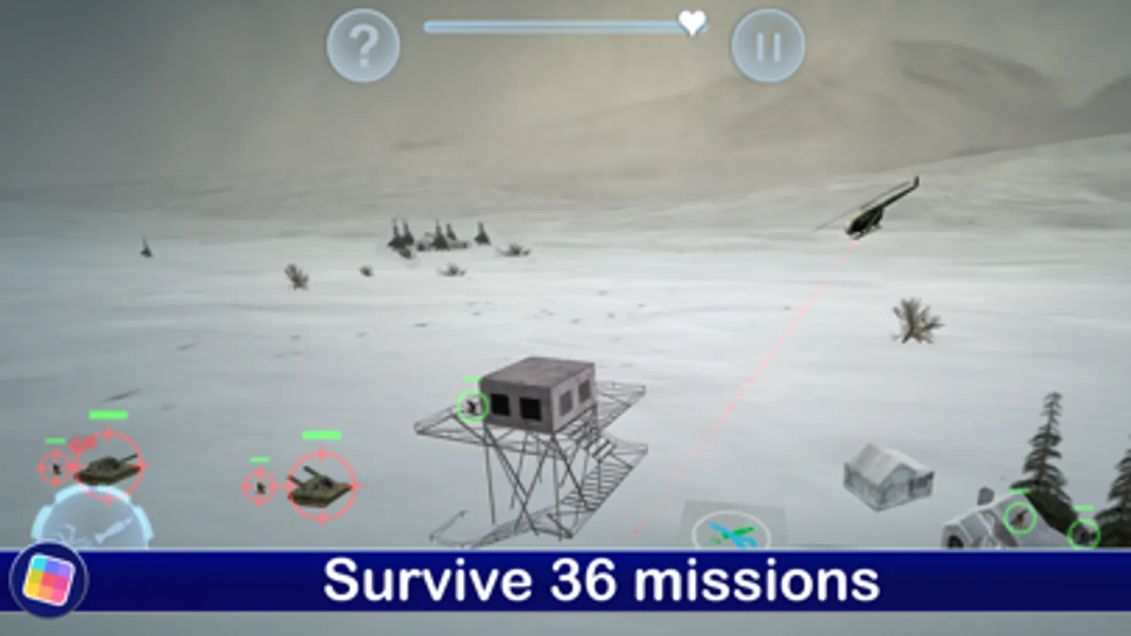 Take flight in 36 different missions set across 12 different locations. Master the controls of your speedy and agile helicopter as you take on missions in some of the deadliest terrain on the planet. Use your machine gun, missiles, and bombs to fight back against the enemy forces. Battle rocket-launcher wielding soldiers, anti-aircraft turrets, tanks, and even enemy choppers.