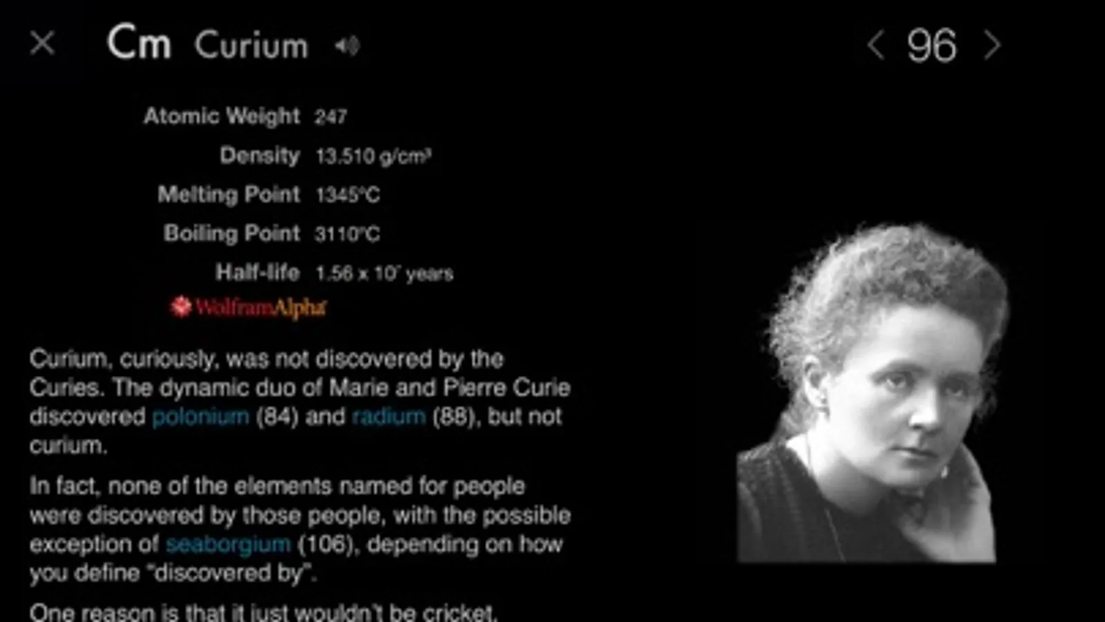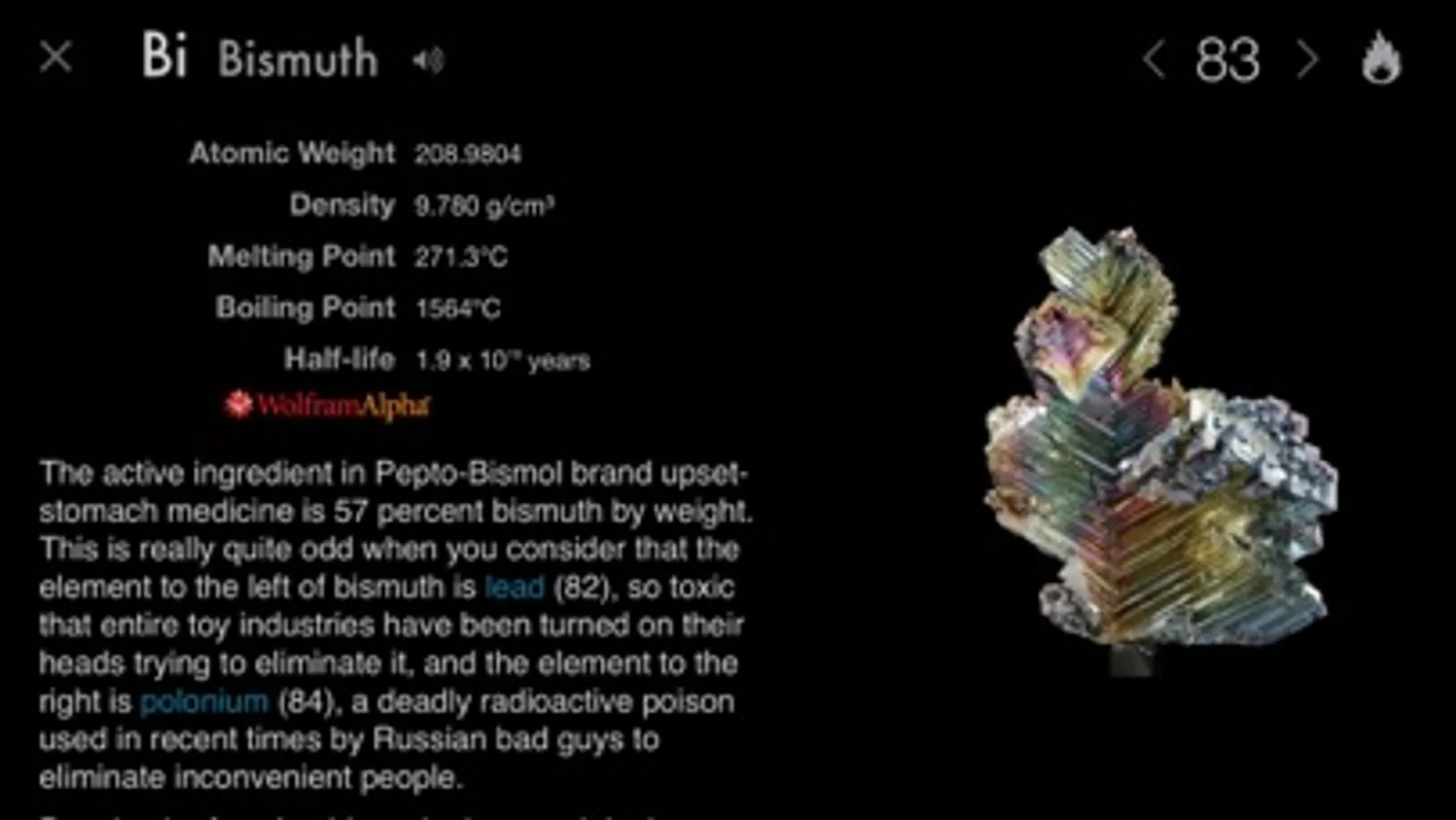 Touch the element name at the top of the page and you can see that element’s name in over a dozen different languages. Choose one and you’ll find that the entire book, stories, captions and all, switches to that language: The Elements includes both the full English original text and over a dozen full translations.