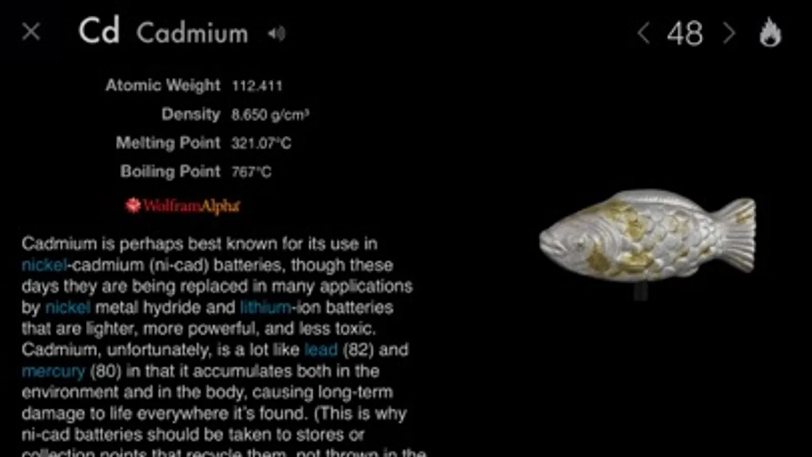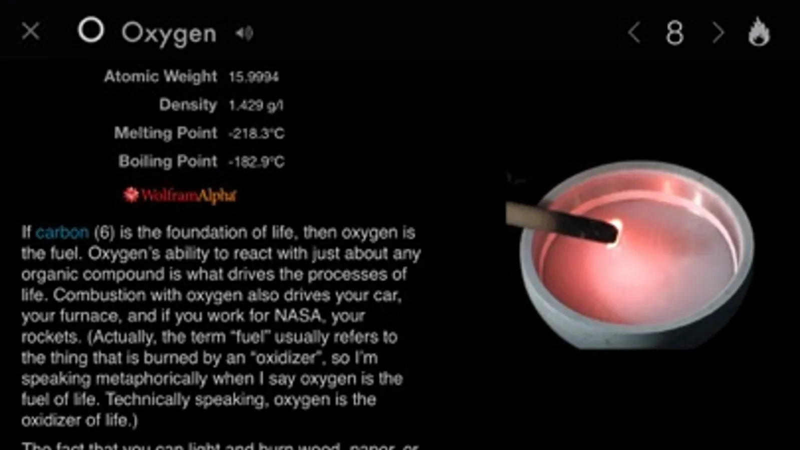 Start off on a living periodic table where every element is shown with a smoothly rotating sample. To read about gold, tap the gold nugget. Immediately you see the sample filling the screen, photographed to razor sharpness and rotating around a complete circle in front of your eyes. Enjoy the extensive array of facts and figures. Next find a fascinating story about the element, surrounded by carefully photographed objects representing it. Every one of these objects, well over 500 in total, is a freely rotatable, live object that you can examine from all sides and pinch zoom to see in unprecedented detail.
