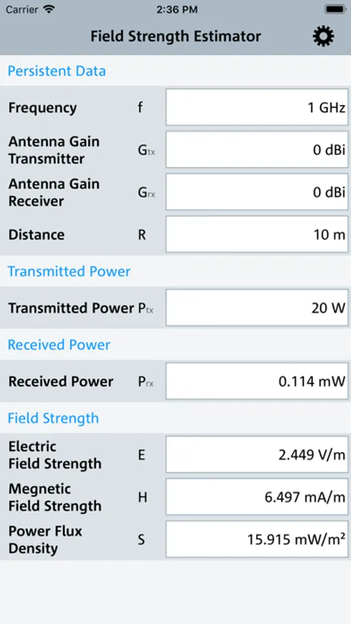The program Field Strength and Power Estimator calculates power flux density, electric and magnetic field strength from the transmitted power, associated frequency and gain of the transmitting antenna.