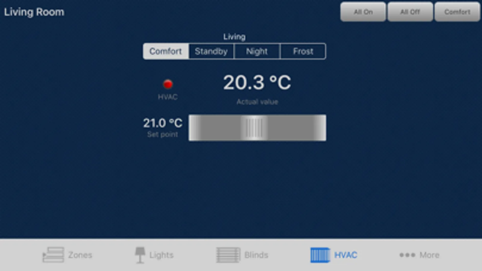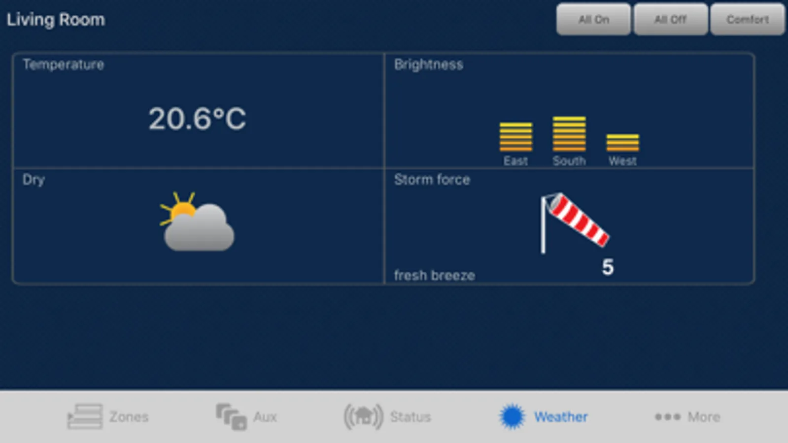 Easily control your lights (including light scenes), blinds, auxiliary functions (like status or HiFi components) and heating system (HVAC) with your iPhone/iPad/iPod touch and access status or your on-site weather data.