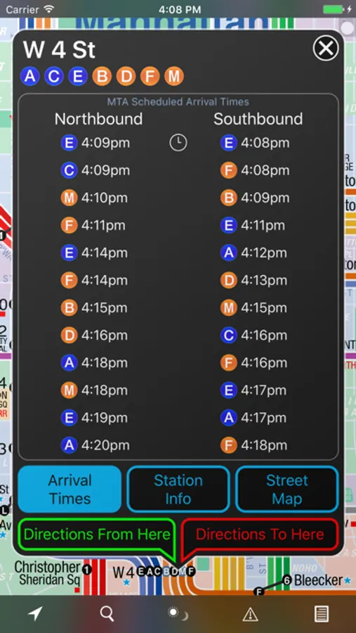 Touch and hold any station for 3 seconds to bring up train arrival times and a street map showing station entrances and exits.