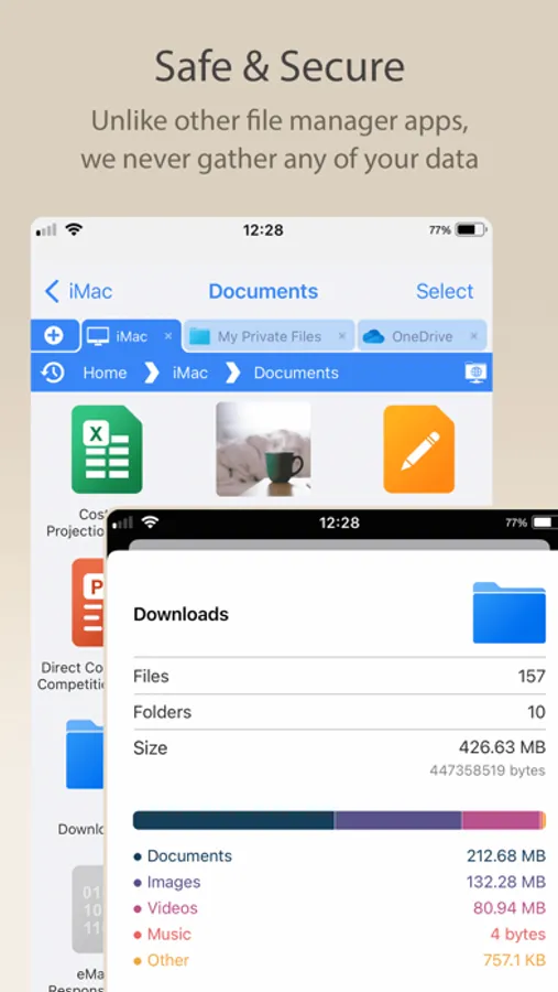 FileBrowser securely stores your passwords in the iOS keychain and uses iOS encryption features to protect your local content. Protect local files using a password, TouchID or FaceID.