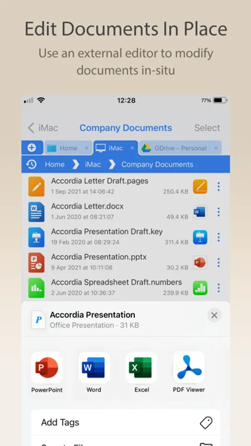 No more copying of documents between apps. Launch an app to edit a network document in-place, such as Word or Pages or any of the Office and Mac suite. Changes are saved to the original document automatically.