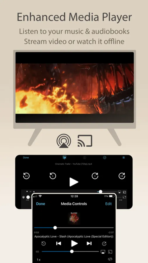 Stream movie files or listen to music, both with AirPlay™ and Chromecast support. Use our built-in viewers or stream video to other apps.