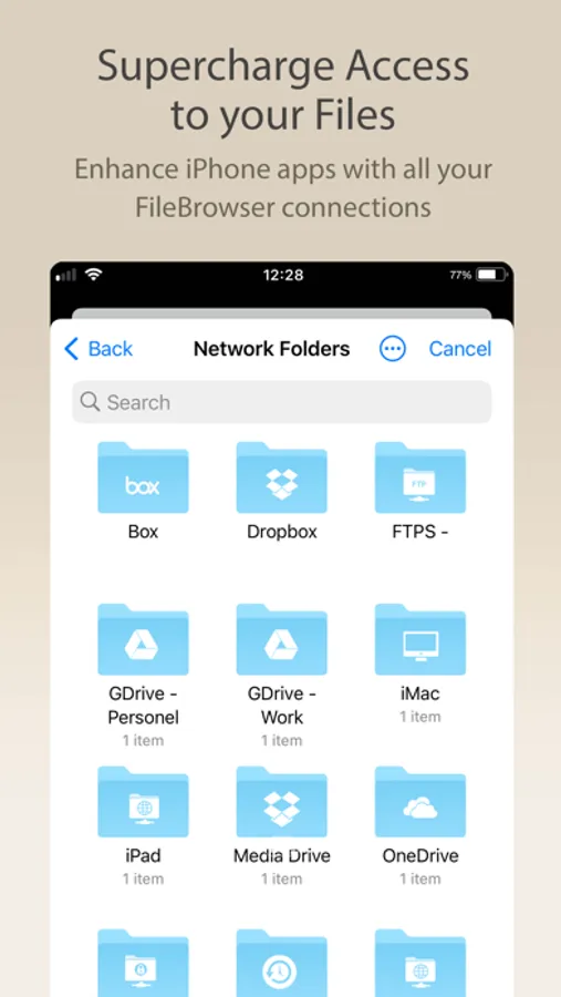 FileBrowser allows you to access all your connections from the iOS Files app and other apps that use this as their document chooser, bringing network access to those apps.