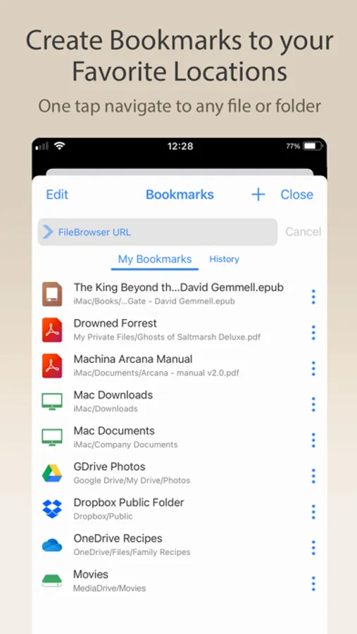 Create bookmarks to your favorite locations & folders. Use a single tap to connect and browse to a favorite folder.