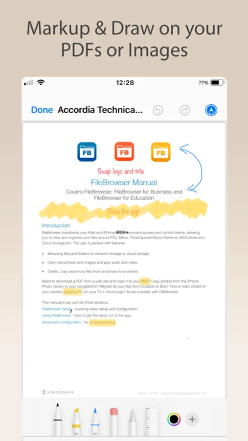 Use the built-in annotation tools for PDFs and images, or use the iOS annotation tools to add notes, drawings or highlight text.