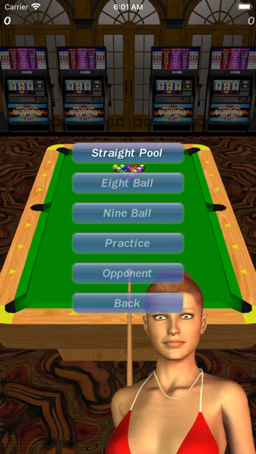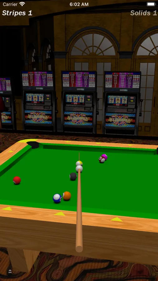 - Four game types: Straight pool, 8 Ball, 9 Ball, and Practice.