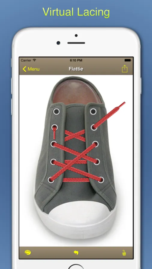 What's more, you can design your own patterns! Just as quickly as you can drag your finger, our virtual laces snap to the eyelets of a virtual shoe. It's all about your creativity, so you can export or email your best "lace art" with ease.