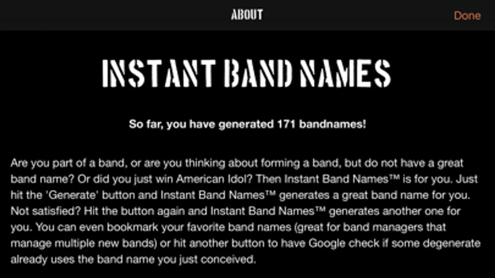 Are you part of a band, or are you thinking about forming a band, but do not have a great band name? Then Instant Band Names is for you. Just hit the 'Generate Band Name' button and Instant Band Names generates a great band name for you. Not satisfied? Hit the button again and Instant Band Names generates another one for you. You can even bookmark your favorite band names (great for band managers that manage multiple new bands) or hit another button to have Google check if some degenerate already uses the band name you just conceived. We know a great band name can be worth millions but Instant Band Names is free! Try it now!