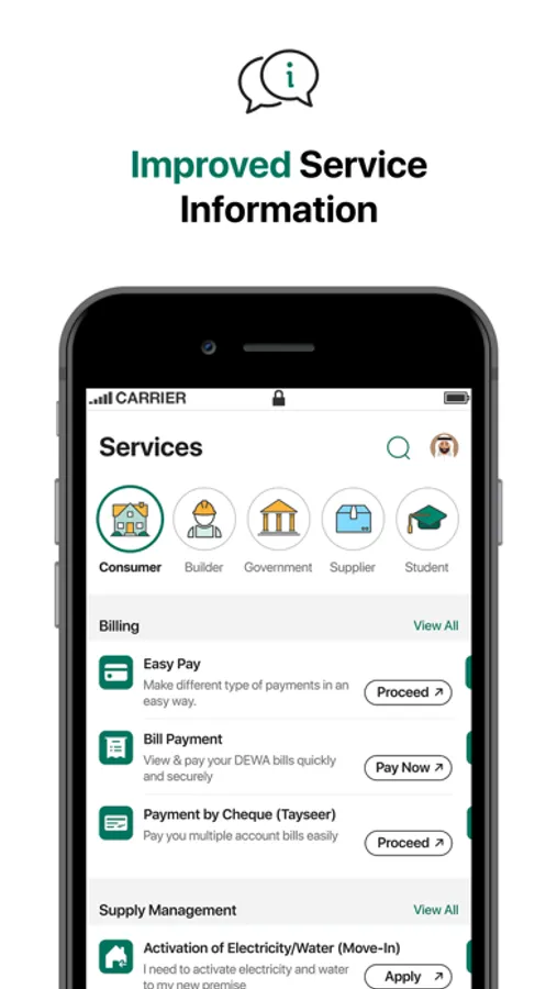 DEWA Smart App provides a unique interactive platform offering an elevated digital experience, powered by integrated bundles of innovative services and features, delicately designed to exceed the expectations of consumers, builders, suppliers, and students. The App creates an added sustainable value for all stakeholders.
