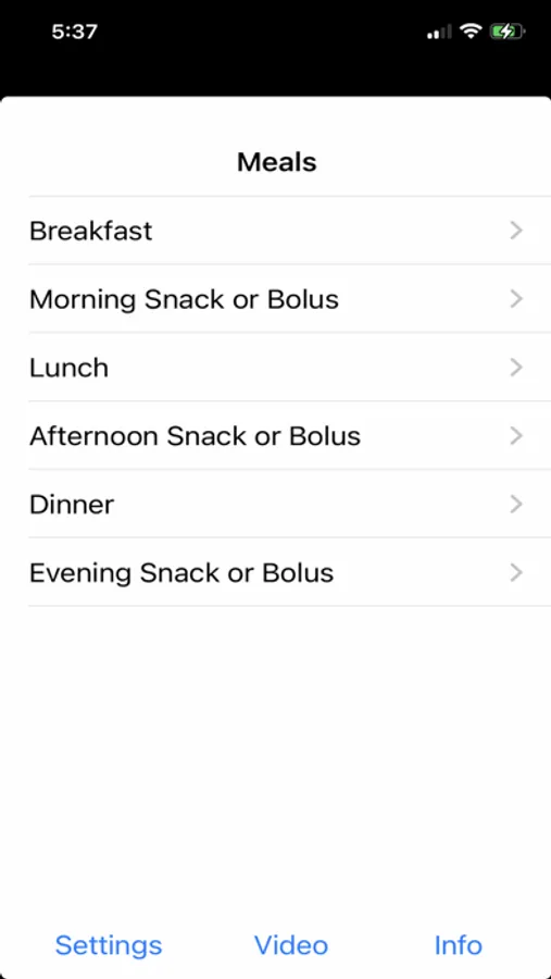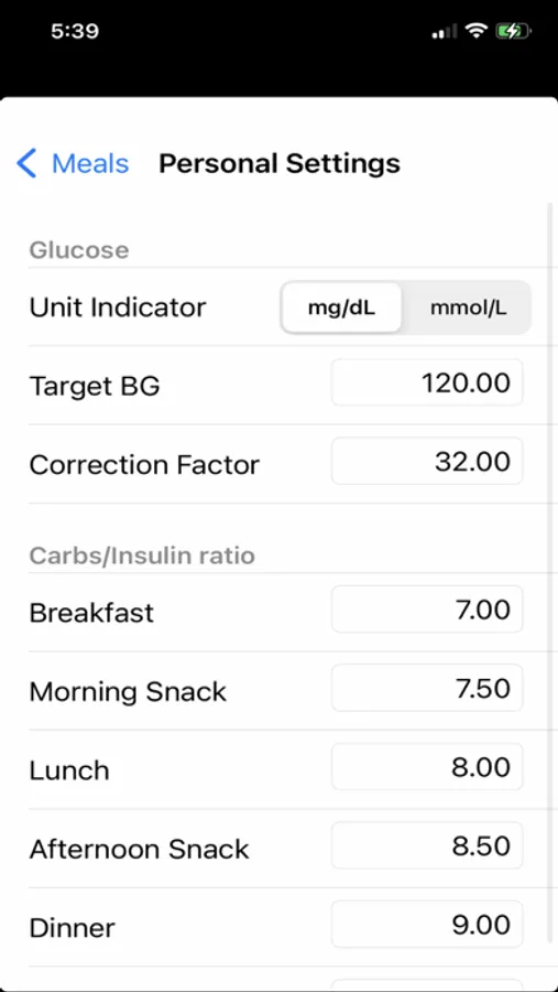 3. Input up to six different Carbs/Insulin ratios (also known as Carbohydrate Factor), for breakfast, morning snack or bolus, lunch, afternoon snack or bolus, dinner, and evening snack or bolus.