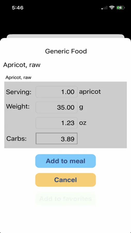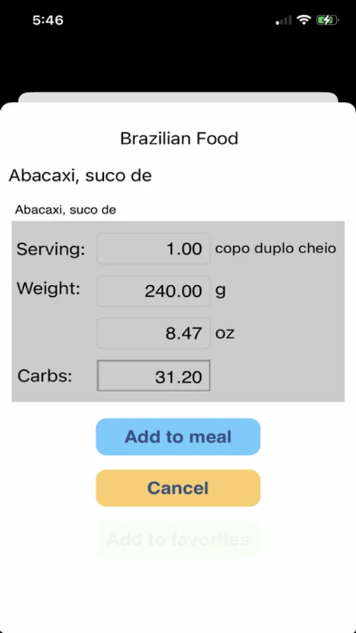 * Modifying serving or weight to get the corresponding carbs for the food.