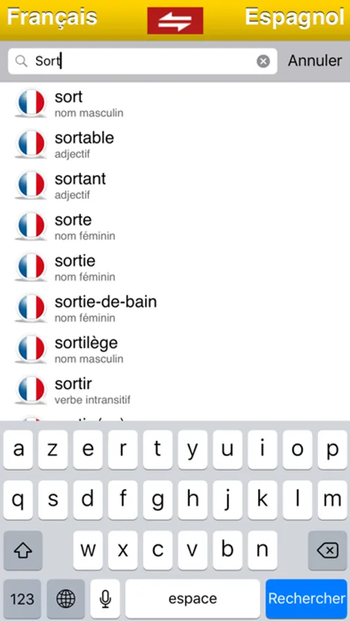 Rapide, la recherche s’effectue en saisissant directement le mot souhaité sur le clavier de l’iPhone, le positionnement s’effectue pendant la saisie du mot.