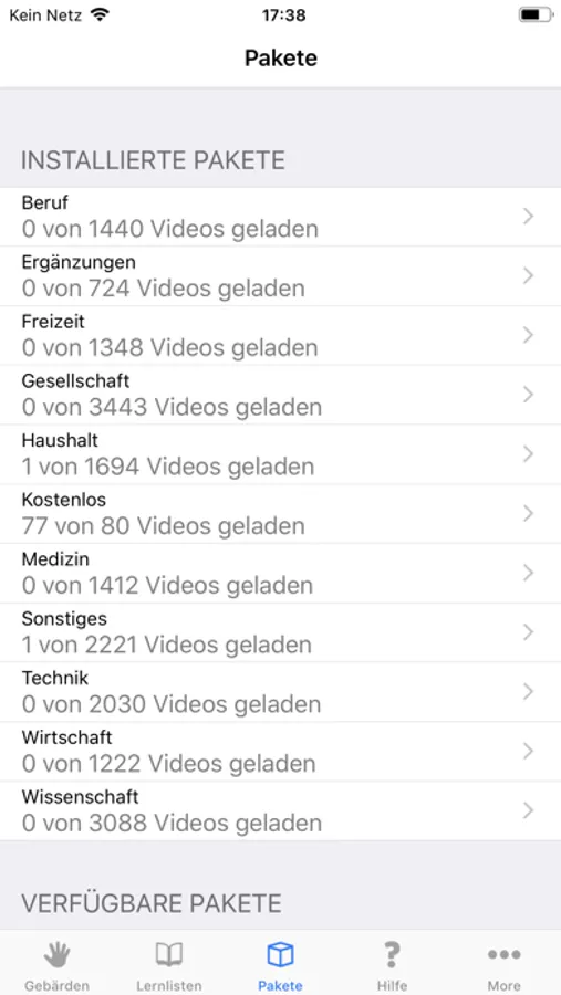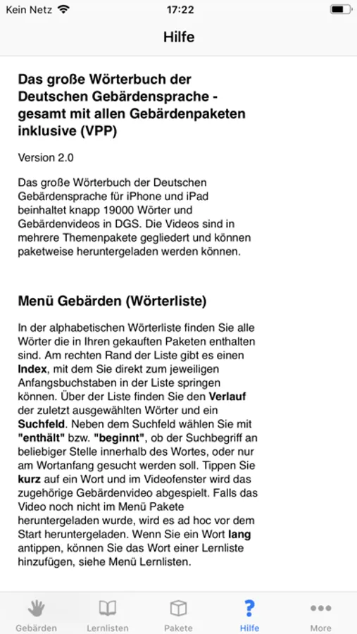 Das App ist mit einem Wortumfang von 80 Wörtern zum Kennenlernen kostenlos. Der restliche Wortschatz ist in 10 Themenpakete gegliedert, die einzeln gegen Gebühr in das DGS Wörterbuch heruntergeladen werden können. Hierbei entsteht ein erhebliches Datenvolumen von insgesamt ca. 2GB, weshalb Sie den Downnload möglichst mit WLAN Verbindung ausführen sollten. Nach dem einmaligen Download braucht die App keine Online-Verbindung mehr.