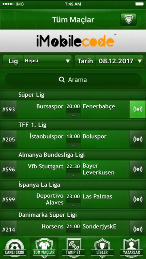 O an oynanan macların listelendigi bolumudur.Istediginiz maci listenin yukarisinda yer alan arama kismindan Iddaa kodu,takim,lig bilgilerine gore arayabilir ve kolayca ulasabilirsiniz. Maclarin sol tarafinda sirasi ile macin Iddaa kodu ve anlik dakika bilgileri gosterilmektedir. Macla ilgili detayli dakika,skor,gol,kart ve oyuncu degisikligi bilgilerine ulasmak icin takim isimlerine tiklayabilirsiniz.Mac detay sayfasindaki paylas butonuna tiklayarak maci Facebook,Twitter profillerinizde yorumunuz ile arkadaslarinizla paylasabilir veya e-mail araciligi ile gönderebilirsiniz. Maclarin yaninda yer alan notification ikonuna tiklayarak takip ettiklerim listenize ekleyebilir ve macin onemli olaylarindan ve canli skor bilgilerinden anlik bildirim ozelligi ile haberdar olabilirsiniz.