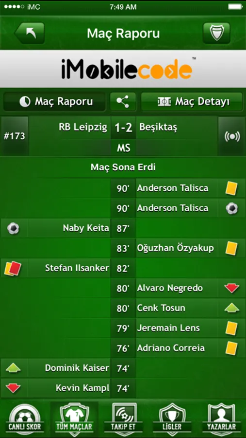 -Gecmis maclarin Iddaa kodu,skor,gol,kart ve oyuncu degisiklikleri bilgilerine