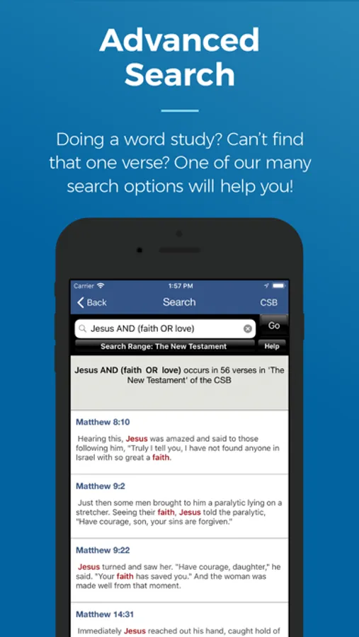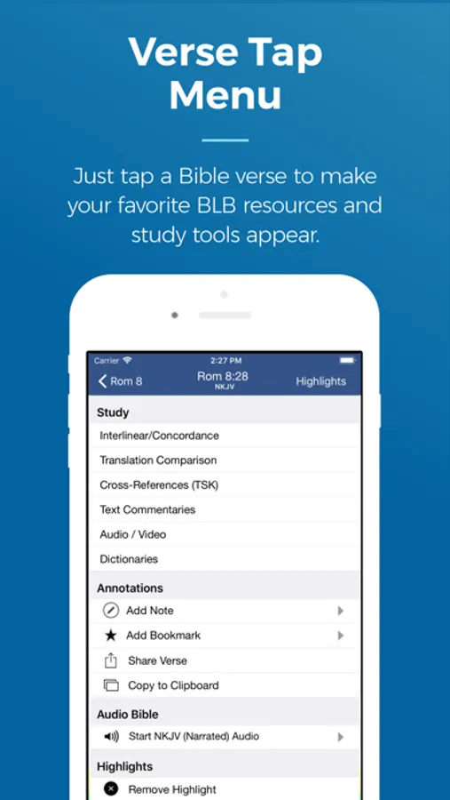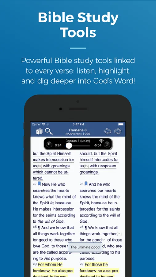 Dig deep into God’s Word with over 30 Bible versions, audio Bibles, text and audio commentaries, Hebrew / Greek lexicon, concordances, dictionaries, advanced word searches, and more. Customize your reading experience with rich color themes, fonts, auto scrolling, and parallel version views. Personalize your study with highlighting, underlining, and note taking options – all with Cloud back up.