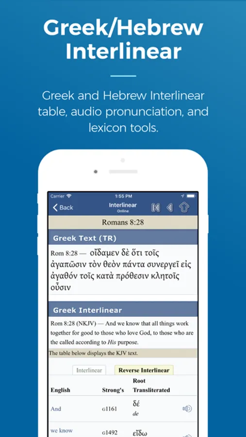 • Choose from over 30 Bible translations available in English, Spanish, Chinese, Korean, German, Russian, French, Hebrew, and Greek