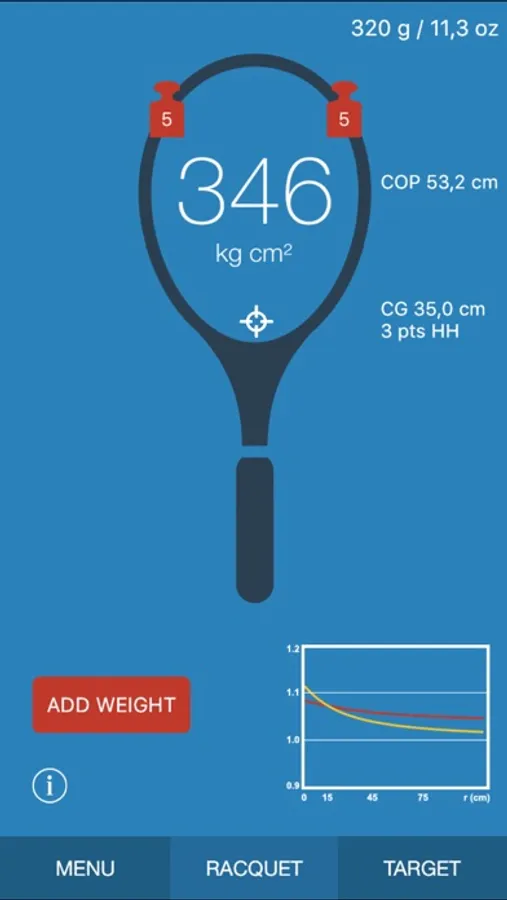 - Enter target values for the racquet and let RacquetTune distribute the weights automatically.
