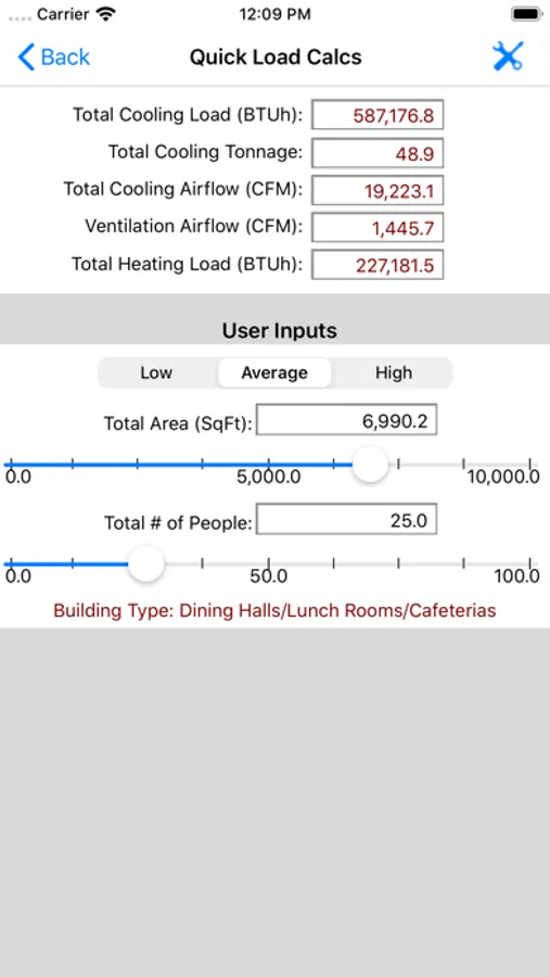 This app performs rule-of-thumb HVAC cooling and heating load calculations for many types of commercial, industrial, institutional, and residential buildings. It allows you to quickly calculate the total required cooling and heating loads (in BTU/hr or Tonnage) and air flows (CFM or L/s) by inputting just the building type, total square area and number of people.