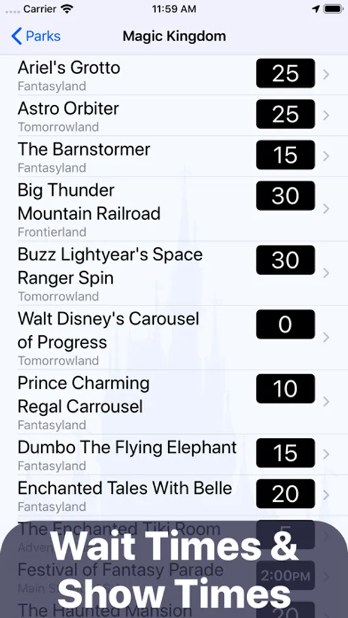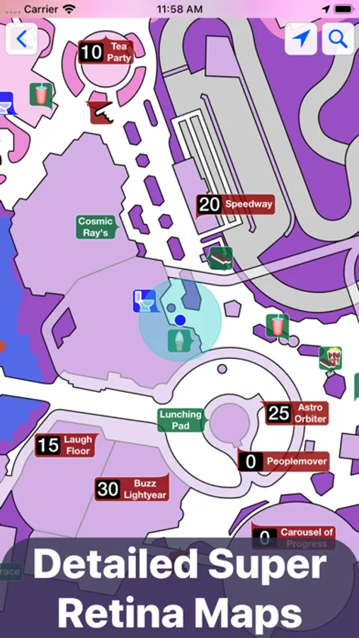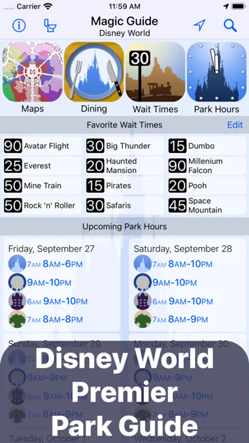 The premier Magic Guide ® app for Disney World includes current wait times, retina park maps, dining menus with search, park hours, favorites, Nearby GPS, photos, and much more.