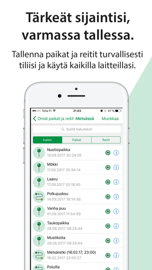 - Synkronoi paikat ja reitit automaattisesti web- ja mobiiliversioiden välillä