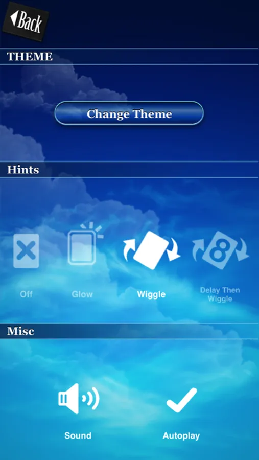 • Playable cards wiggle or glow -- turn off for a bigger challenge. The more the cards wiggle the better the move.