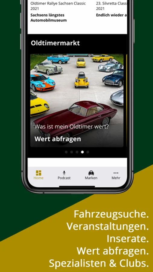 **Oldtimermarkt: Fahrzeugsuche, Veranstaltungen, Inserate, Oldtimerwert abfragen sowie Spezialisten & Clubs & vieles mehr ganz einfach über die App steuern.