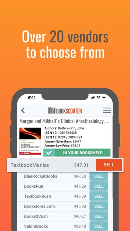 The BookScouter mobile app compares prices from 30+ vendors buying and selling books: AbeBooks, Alibris, Amazon.com, BetterWorldBooks, Biblio,Bigger Books, Book Depository, BooksRun, Campus Book Rentals, Chegg, Discover Books, eBay, eBooks.com, eCampus.com, eCampus.com Marketplace, Knetbooks, RedShelf, Second Sale, Textbook Solutions, TextbookRush, Textbooks.com, TextbookX, ValoreBooks.com, VitalSource, WinyaBooks, BeerMoneyBooks, BlueRocketBooks, Bookbyte, BookMonster, BooksIntoCash, BooksRun, Bookstores.com, BookToCash, CollegeBooksDirect, Comic Blessing, eCampus, Empire Text, PiggyBook, Powell's, RentText, Sell Books, SellBackBooks, SellBackYourBook, Textbook Solutions, TextbookCashback, TextbookManiac, TextbookRush, TopDollar4Books, ValoreBooks, WinyaBooks, Ziffit by World of Books.