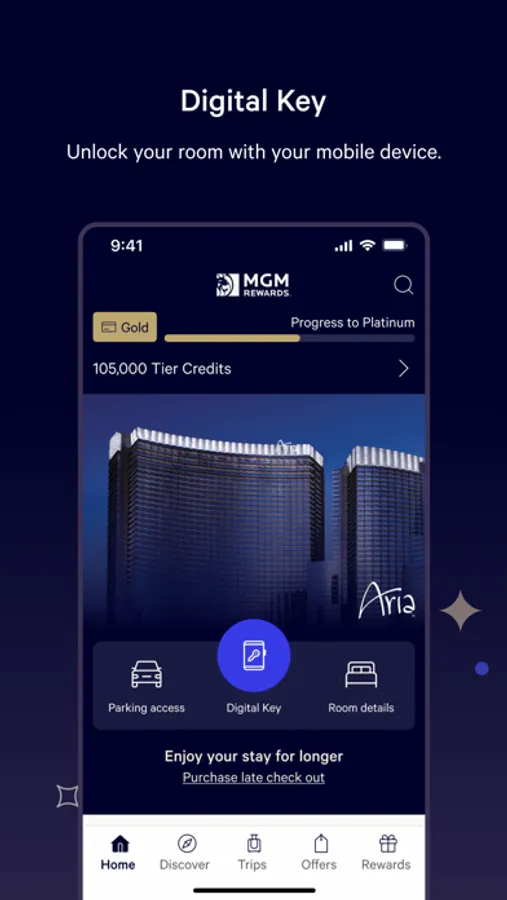 *MGM Rewards membership (must be 21 years or older) required to use mobile check-in and/or digital via MGM Rewards Mobile App. Use of digital key subject to ID verification requirements. To receive room ready push notifications as part of the mobile check-in process, you must opt-in to receive push notification on your mobile device. If Location Services are enabled, we will prioritize assigning you an available room, and recommend dining options nearby. Availability of mobile app features may vary by property. Subject to Mobile App Terms of Use, Digital Key Terms of Use, and Privacy Policy.
