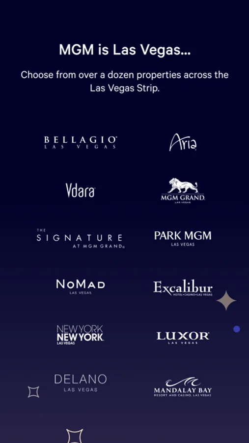 The MGM Rewards app lets you search and book the lowest hotel rates, dining reservations, and show tickets for events within all of our world-class brands: Bellagio, ARIA, Vdara, MGM Grand Las Vegas, The Signature at MGM Grand, Mandalay Bay, Delano Las Vegas, Park MGM Las Vegas, NoMad Las Vegas, New York-New York, Luxor, Excalibur, MGM National Harbor, MGM Springfield, MGM Grand Detroit, Beau Rivage, and MGM Northfield Park.