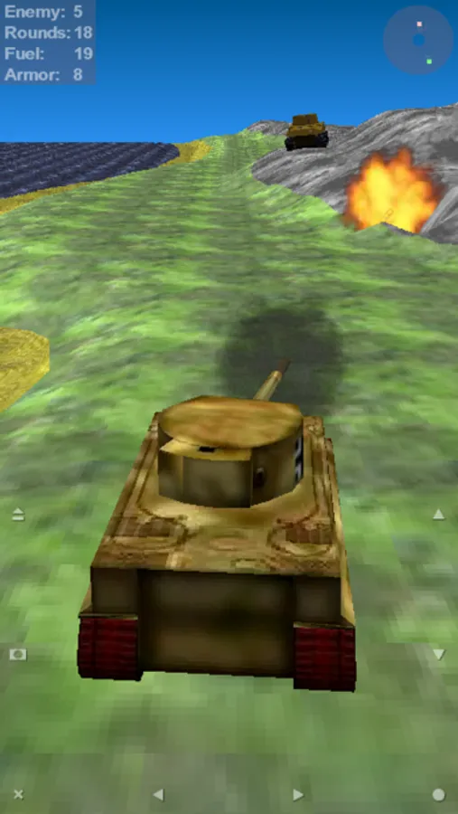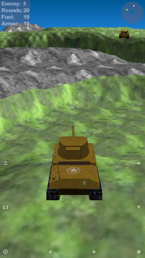 A status panel shows the number of enemies left, rounds remaining, fuel, and armor strength. The last three can be replenished by ramming (not shooting) an enemy truck. If you run out of fuel or armor, or for some reason drive your tank into the water, in addition to an untimely death you will be forced to retreat one sector. If you wipe out the enemies you will advance one sector, retaining any excess supplies you have scavenged. The game ends when you take the enemy capitol, or they overrun yours. Either way the brass will want to have a talk with you.