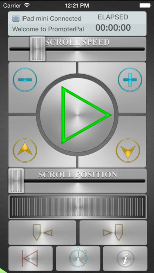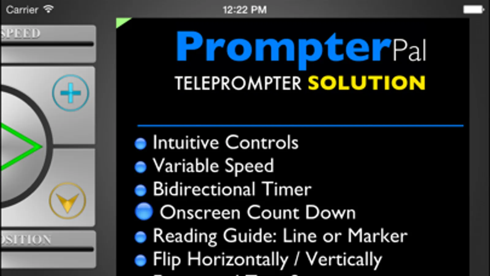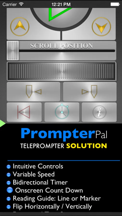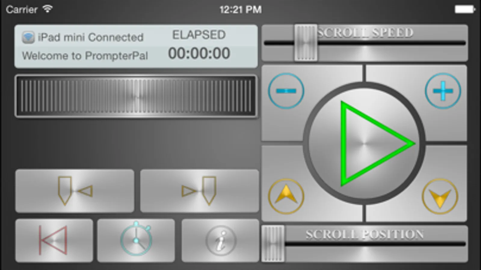 PromptRemote is made to control PrompterPal running on an iPad. PromptRemote provides control of speed, scroll position, shuttle wheel, play/ pause, fast-forward and rewind control, start over and timer controls, markers, file loading and provides timer feedback.