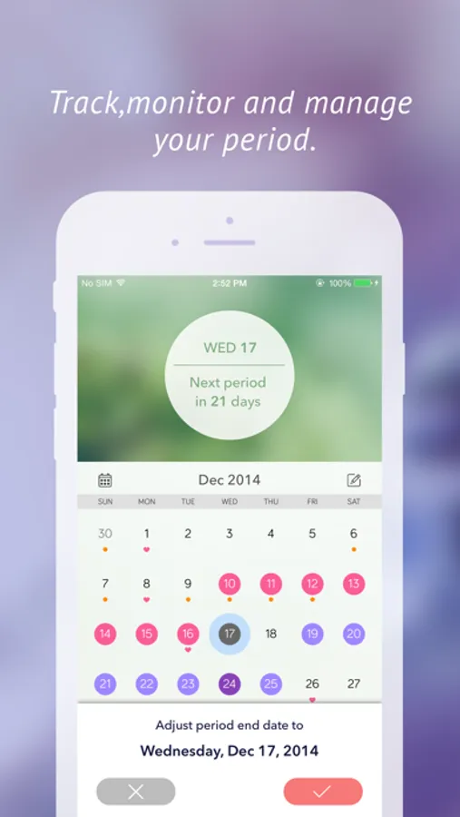– Calendar view shows your cycle at a glance