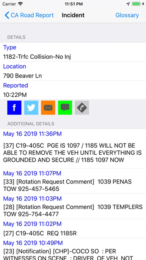 Each CHP incident reported contains the time of occurrence, location, and details of the incident.