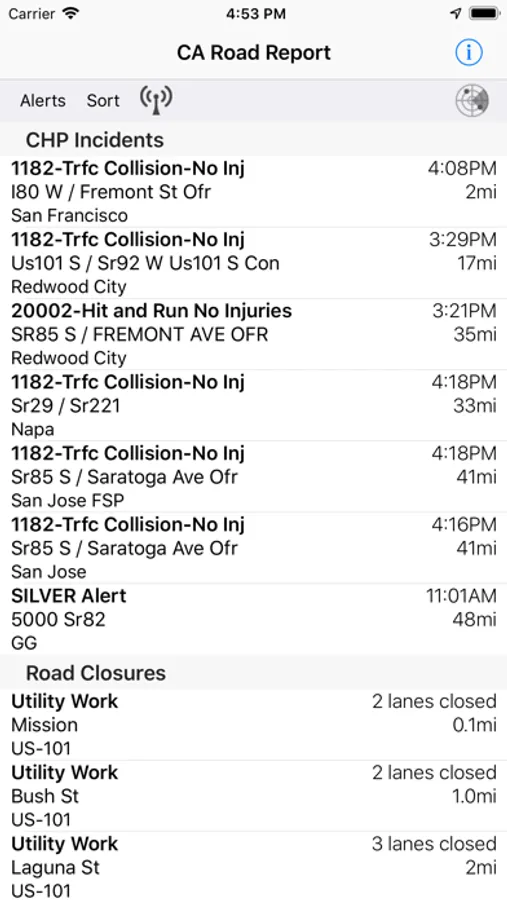 - View CHP Incidents in areas nearby or from a list of selected areas in either list mode or map mode