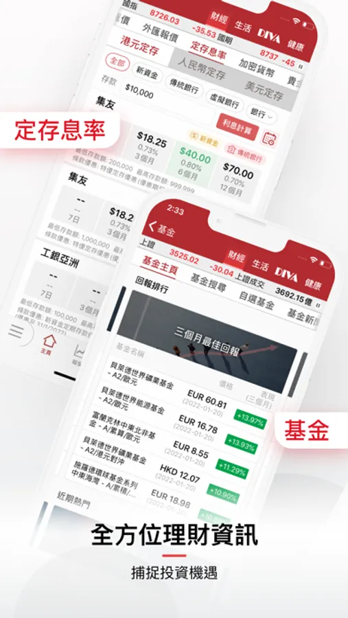 - 貼心理財工具:個人化監察表、ETF及基金精選及回報排行、定存息率比較、匯率比較、銀行交易匯價、MPF營辦商大比拼、積金表現