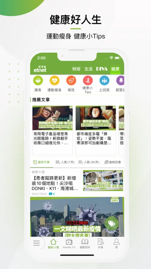 涵蓋家常靚湯食譜、養生食療、瑜珈運動瘦身,無論你是上班族還是銀髮族,etnet陪你全方位打造健康好人生!