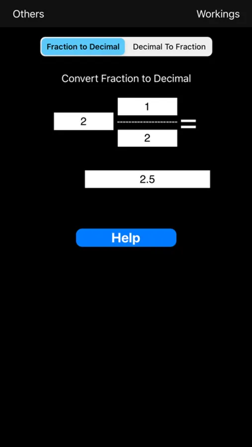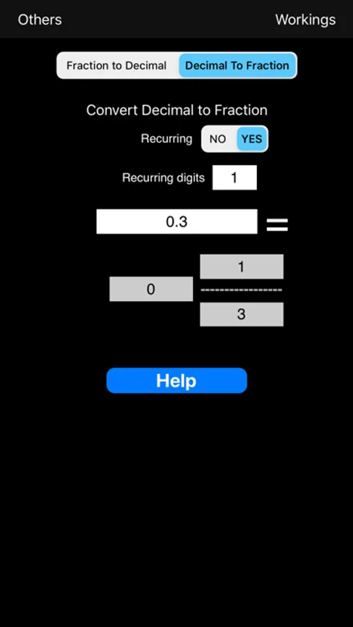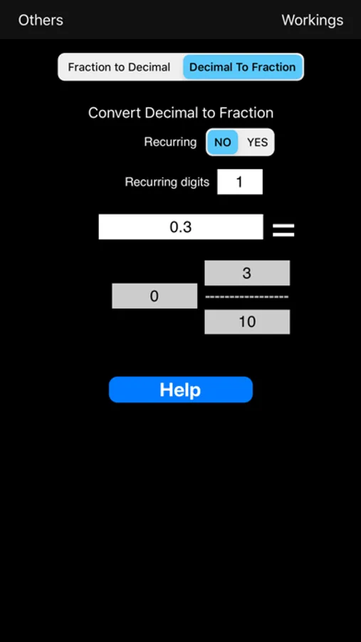 The App can take a fraction and convert it into its decimal equivalent and also provide a page that explains how the answer was arrived at. You can even see whether the decimal is recurring or not. Just type in the fraction in the three boxes provided and the decimal equivalent will be shown. If the answer ends in three '...' then the number is recurring.