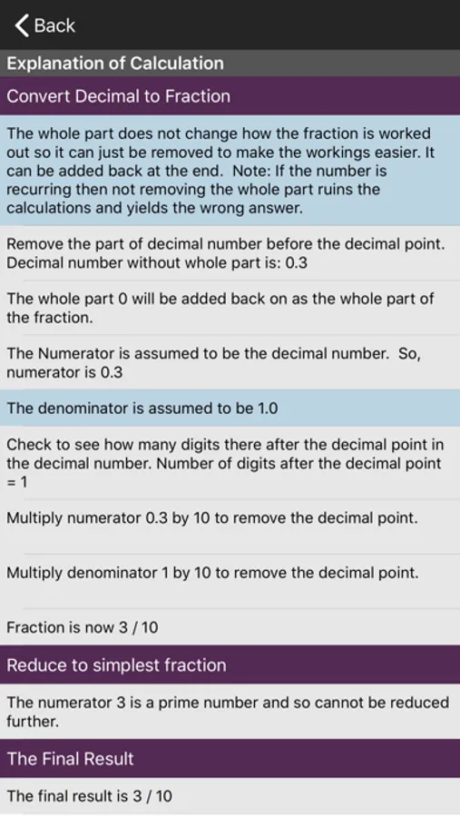 The App can also take a decimal and convert it into its equivalent fraction providing a page that explains how the answer was arrived at. The decimal number can either be specified as recurring or not and if it is how many digits are recurring.